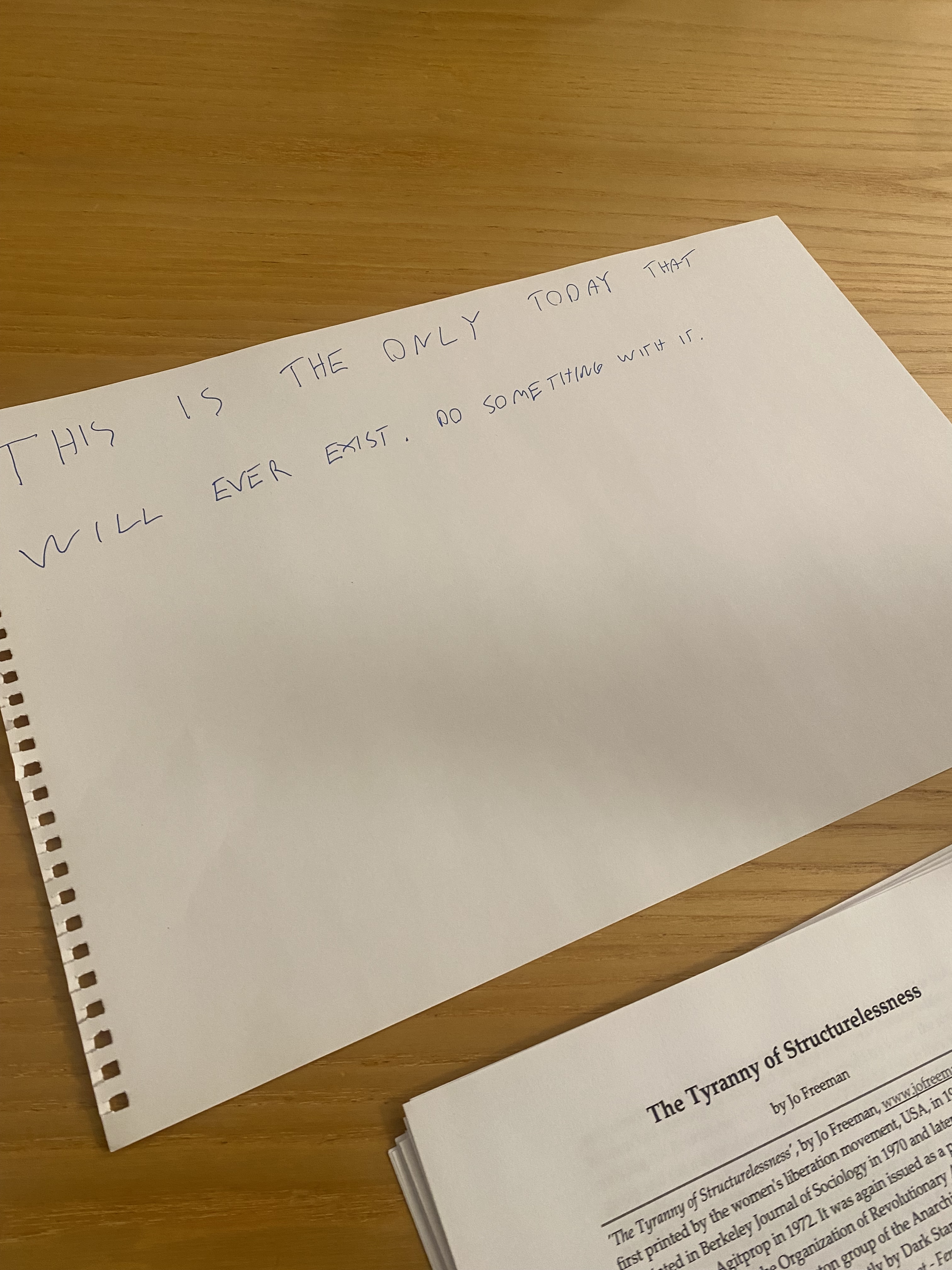 That said, since the conversation, I have held onto something she shared as part of her reflection. She said something to the effect of: “This is the only today that will ever exist. There will never be another December 12th, 2021…ever. So do something with it.” Today when i got to work, I wrote that down on a large piece of paper and affixed it to my desk. What a powerful prompt to internalize each morning. “Oh, you’re tired? Well this day is never gonna happen again. When you look back on this day, will it be defined by some lazy twitter scrolling and a couple of meetings, or can you reach for something that will mark the day as actively lived? Will this day be valuable, valued, and distinct from the rest?”