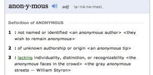 As I sit here on this train, bound for the Meadowlands where I will undoubtedly watch the Jets destroy Randy Moss and the Vikings, it occurs to me that although unnamed, I am not anonymous in this crowd. Miriam Webster offers the following 3 definitions of anonymous, none of which (save the most literal “not named”) describe my state on this train.